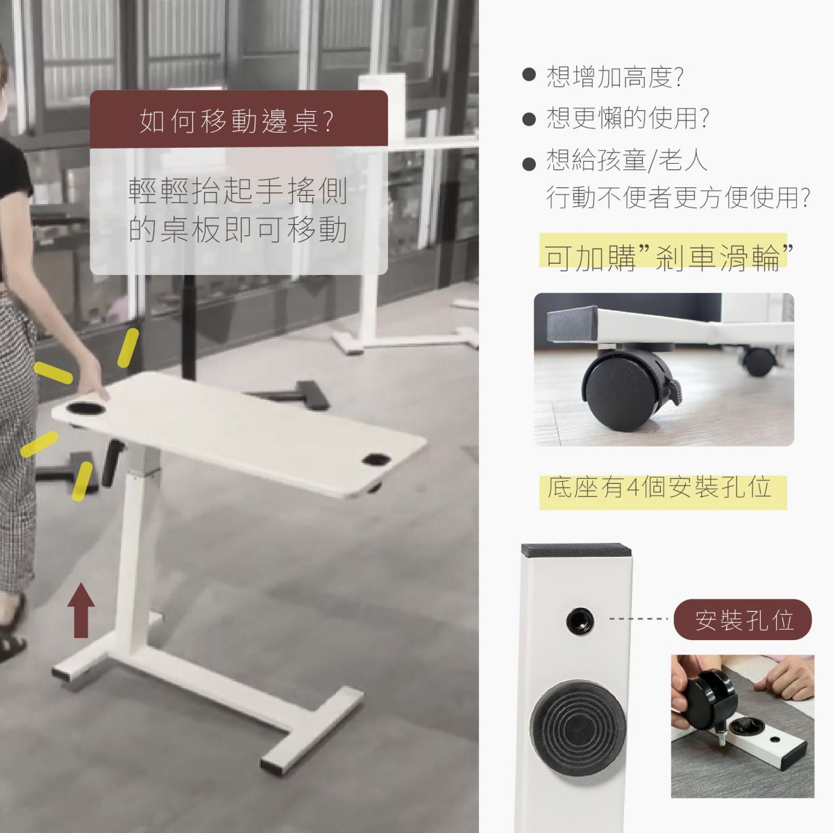 邊桌底座加裝"煞車滑輪"後的高度約落在6~7.7公分