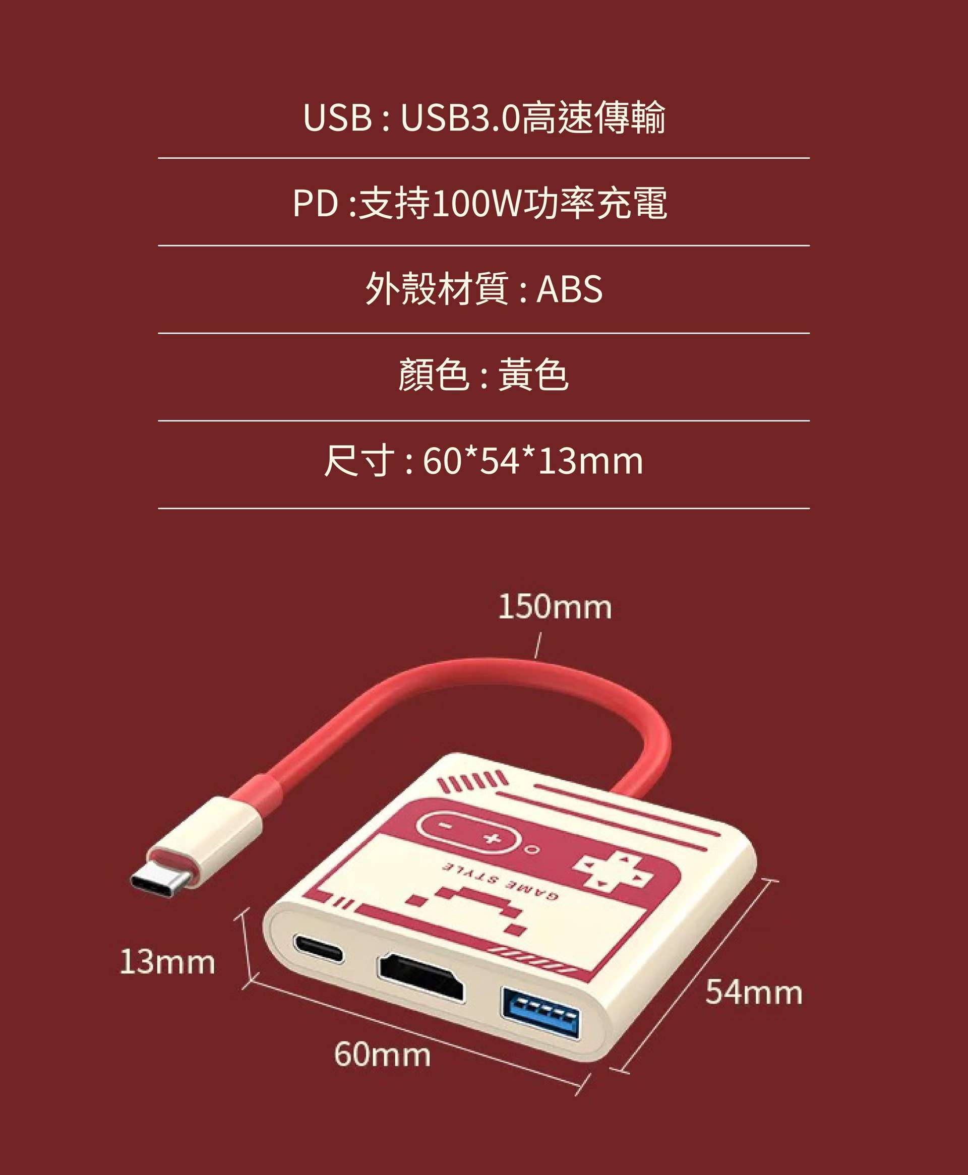 尺寸:主體 60 × 54 × 13mm,線長 150mm